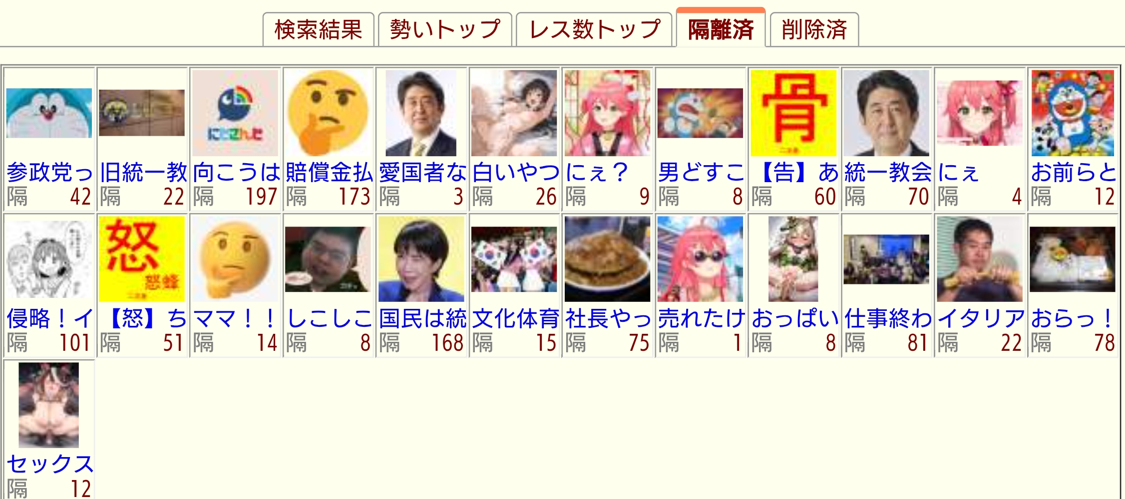 | … | 356無念Nameとしあき26/01/29(木)23:14:07No.1383594141そうだねx1隔離もされてない上に勢い順13位なの草ァ! |