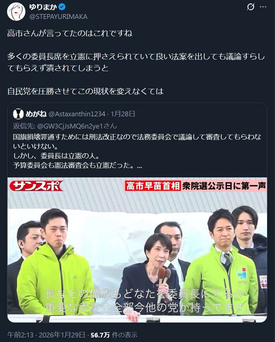 | … | 87無念Nameとしあき26/01/29(木)21:54:21No.1383572706そうだねx20 1769691261199.jpg-(146336 B) マスコミは大義が無い解散だと言い続けてるしこの話はもっと拡散していかないとな |