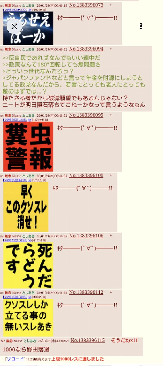 | … | 988無念Nameとしあき26/01/29(木)23:56:04No.1383603638そうだねx3れいわ脳はれいわだけにしろよな |