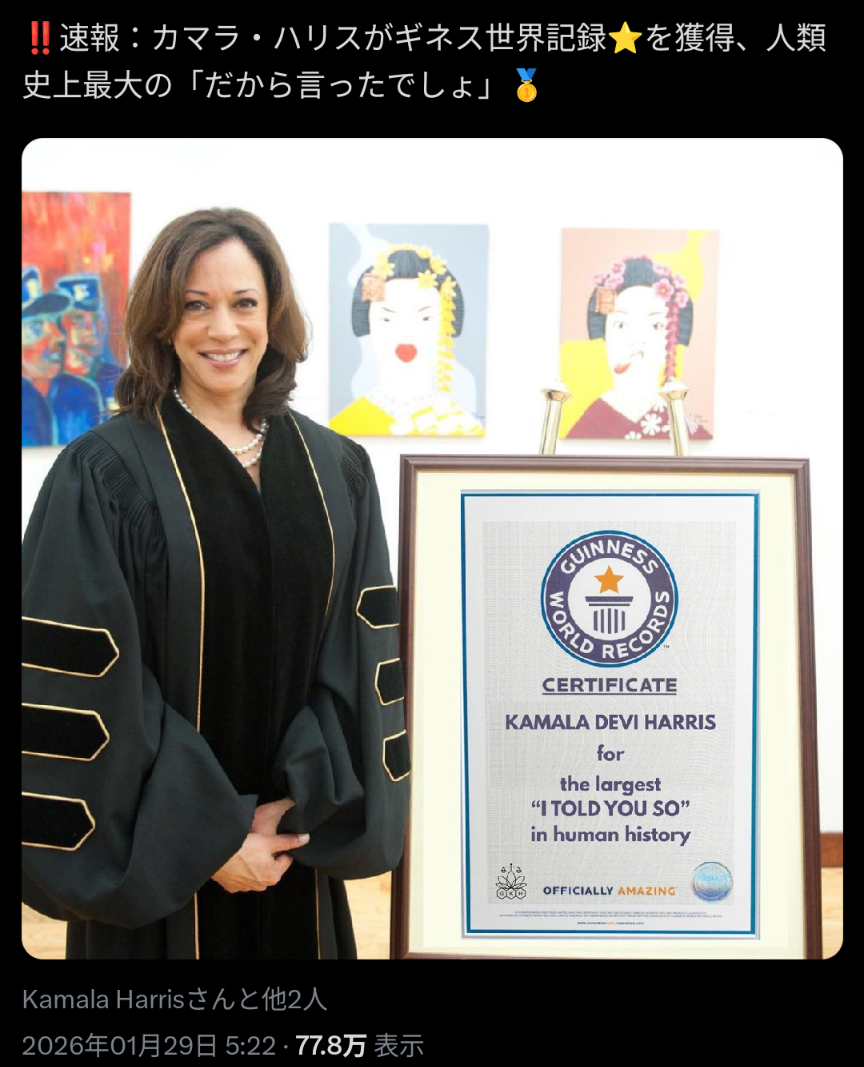 | … | 55無念Nameとしあき26/01/29(木)22:06:03No.1383576086+>オメーがもっと早くバイデンを降ろしとけば違ったろうが! |