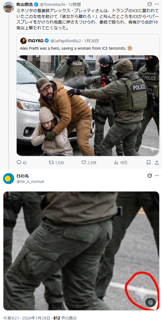 | … | 84無念Nameとしあき26/01/29(木)22:14:58No.1383578648+>>11日後の次の現場(射殺された時)には銃を持って現れたってのがもうね |