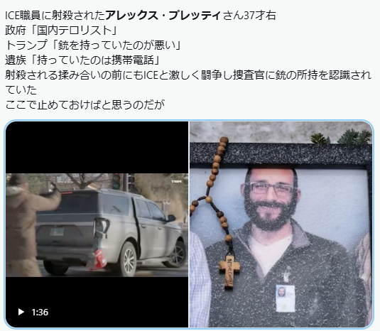 | … | 89無念Nameとしあき26/01/29(木)22:15:56No.1383578922+>>11日後の次の現場(射殺された時)には銃を持って現れたってのがもうね |