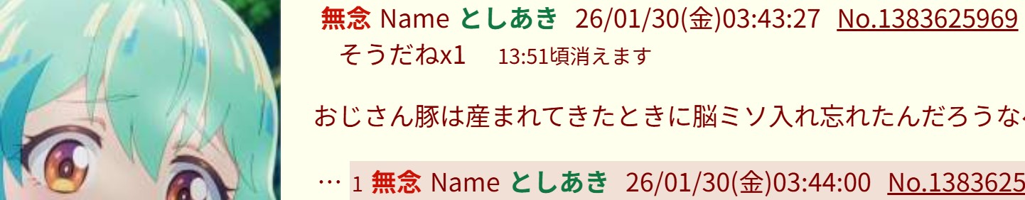 | … | 8無念Nameとしあき26/01/30(金)03:49:44No.1383626164そうだねx1>おじさん豚は産まれてきたときに脳ミソ入れ忘れたんだろうなペッ |