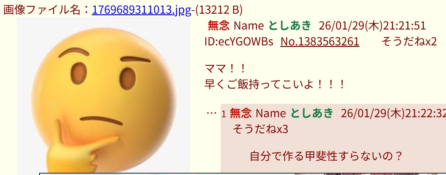 | … | 20無念Nameとしあき26/01/30(金)04:23:27No.1383627822+53(ゴミ)歳児のヤッチャイくんチィース |