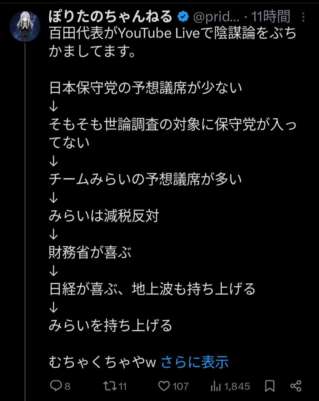 | … | 183無念Nameとしあき26/01/30(金)12:35:55No.1383673086+まあれいわの山本みたいにまずは一議席そのあとは三議席五議席狙いですをまねてほしい |