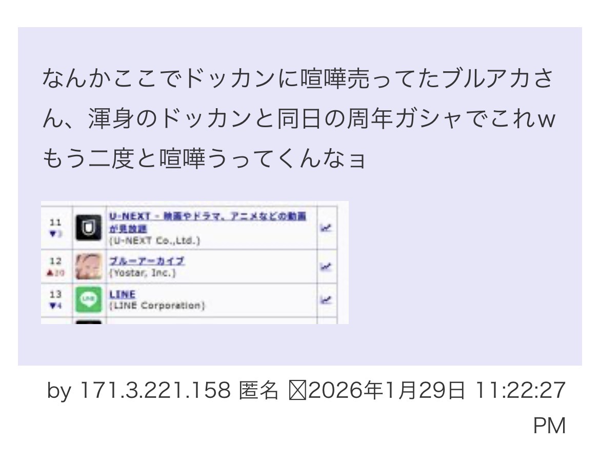 | … | 7無念Nameとしあき26/01/30(金)12:15:27No.1383668674そうだねx1 1769742927523.jpg-(110818 B) 中韓ソシャゲでマウント取ってた雑魚荒らし日本のソシャゲに惨敗してなりふりかまわずになってるな |