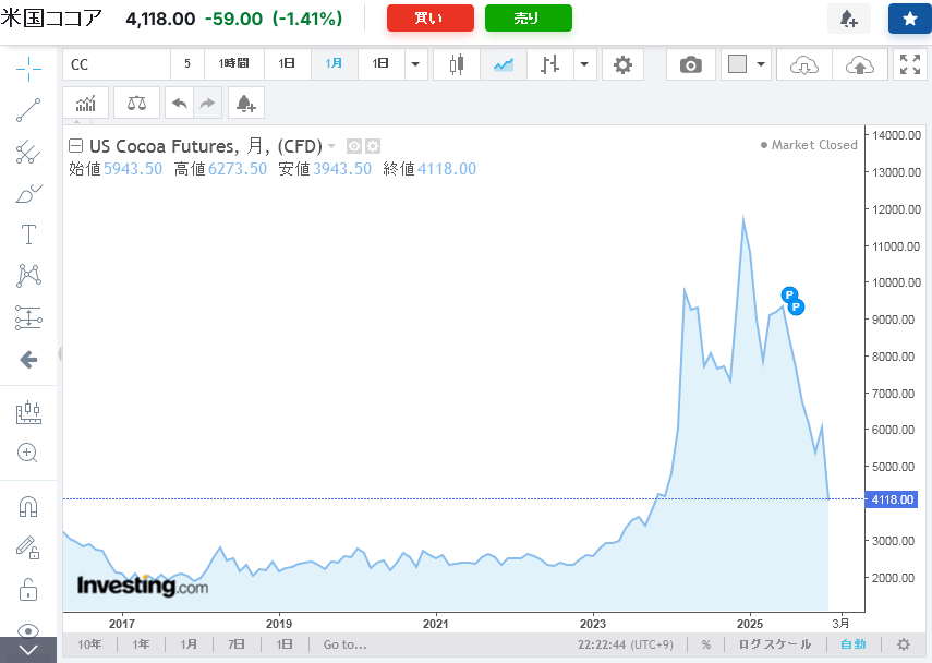 | … | 21無念Nameとしあき26/01/30(金)22:49:13No.1383797994+あれ?カカオって生産国がやばい事になってるんじゃなかったっけ |