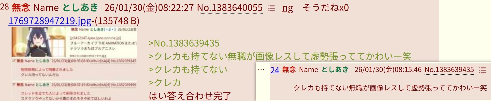 | … | 488無念Nameとしあき26/01/31(土)02:54:37No.1383838008+セルランスレとか立ててたせんせぇや外で他ソシャゲ煽ってたせんせぇを蹴り出せばこんなに笑われなかったのにね |