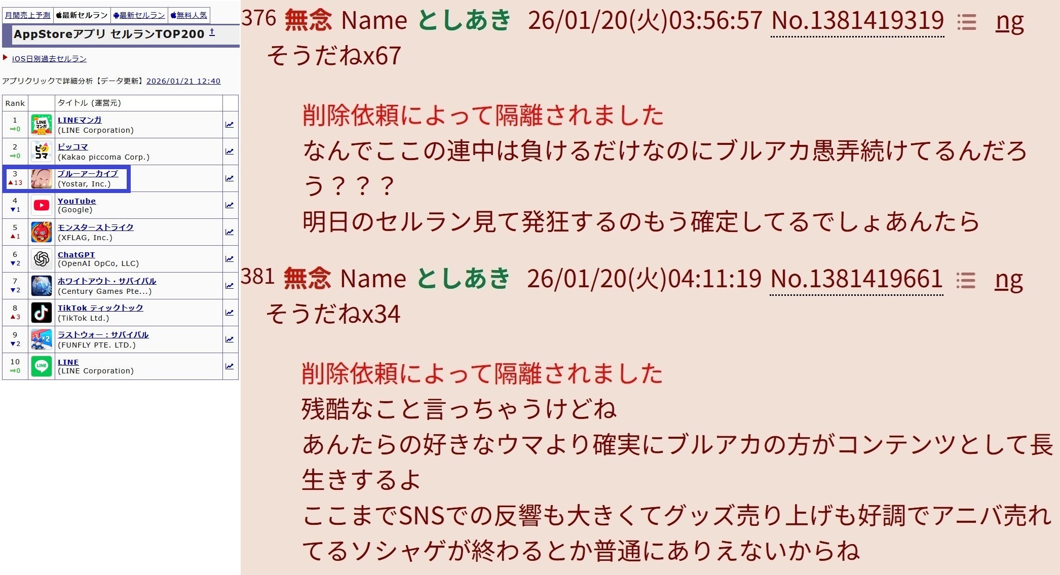 | … | 70無念Nameとしあき26/01/30(金)23:18:26No.1383805980そうだねx4 1769782706480.jpg-(314507 B) ブルアカめっ!!1位すら取れなくなったか!! |