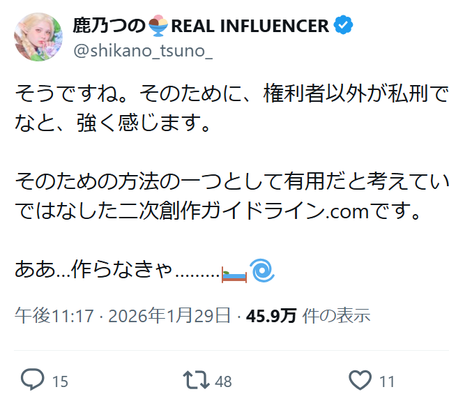 | … | 19無念Nameとしあき26/01/31(土)00:07:09No.1383818697そうだねx1権利者が裁くのはいいんですかね? |
