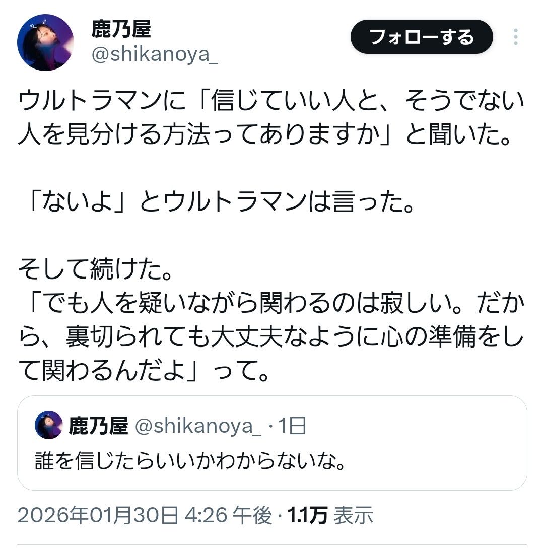 | … | 71無念Nameとしあき26/01/31(土)00:39:33No.1383824750そうだねx1>>ウルトラマン怪文書を出しててダメだった |