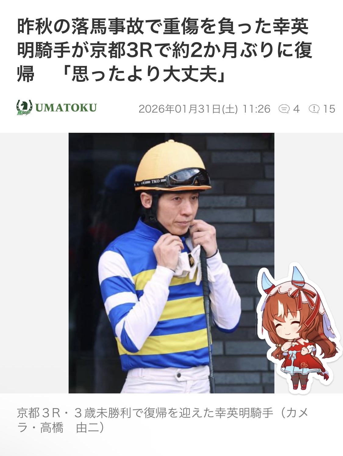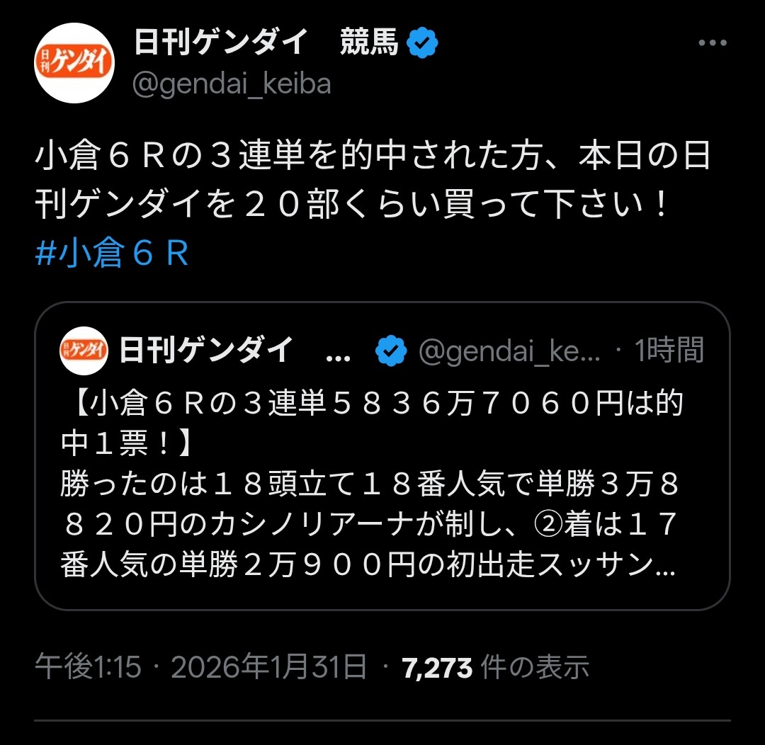 | … | 19無念Nameとしあき26/01/31(土)11:32:01No.1383881125+小牧騎手5レースは予定通り騎乗 |