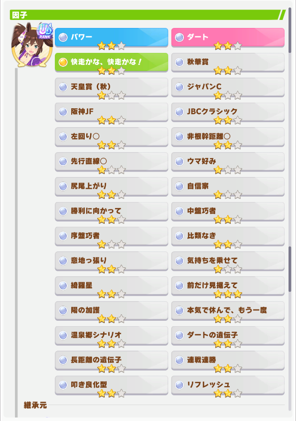 | … | 34無念Nameとしあき26/01/31(土)18:42:54No.1383967666そうだねx1 1769852574958.png-(237266 B) 祖の親(ダート因子)用に長3ダ3の自動周回してたらそこそこ悪くないイナリが出来た |