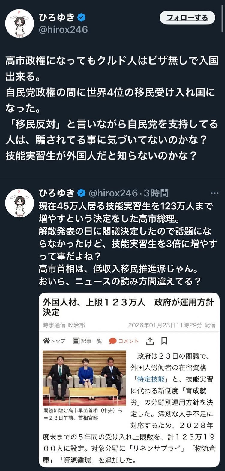 多文化共生と言いつつ本国で暮らすことのできない負け組を大量に日本に招き入れるという欧州が辿った道を突き進む高市政権
