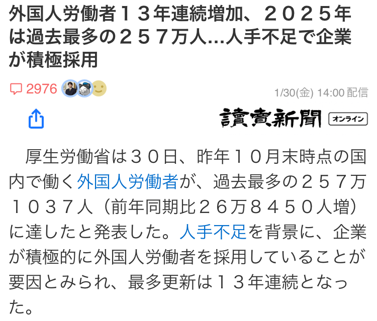 | … | 23無念Nameとしあき26/02/01(日)00:38:17No.1384061385+>これだけ外国人労働者がいるのに人手不足というのが |