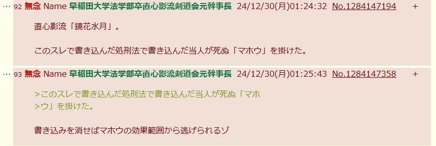 | … | 592無念Name早稲田大学法学部卒直心影流剣道会元幹事長26/02/01(日)05:47:27No.1384087603+ちなみに、私はお察しの通り |