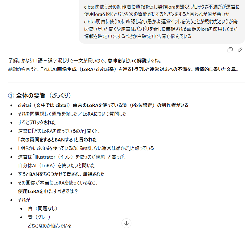 | … | 76無念Nameとしあき26/02/01(日)02:29:55No.1384078885そうだねx1>cibtaiを使う渋の制作者に通報を促し製作loraを聞くとブロックさ不満だが運営に使用loraを聞くとバンを次の質問がにするとバンをすると言われが俺が悪いかcibtai明白に使うのに確認しない愚か者運営イラレを使うことが規約だというが俺は使いたいと聞くや運営はバンドリを脅しに無視される画像のloraを使用してるか情報を確定申告するべきか白確定申告青か悩んでいる |