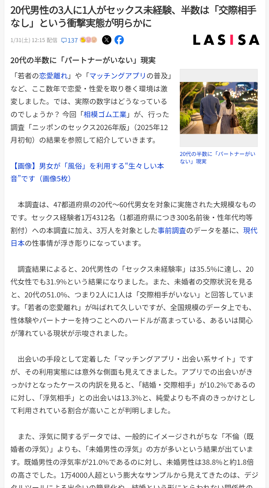 20代男性の3人に1人がセックス未経験、半数は「交際相手なし」という衝撃実態が明らかに