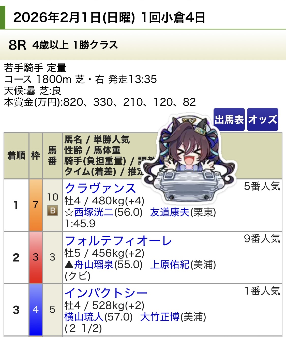 | … | 89無念Nameとしあき26/02/01(日)14:13:49No.1384175684+ 1769922829028.jpg-(166959 B) 小倉は1Rで3着のあと7着8着7着10着13着12着13着11着だべ |