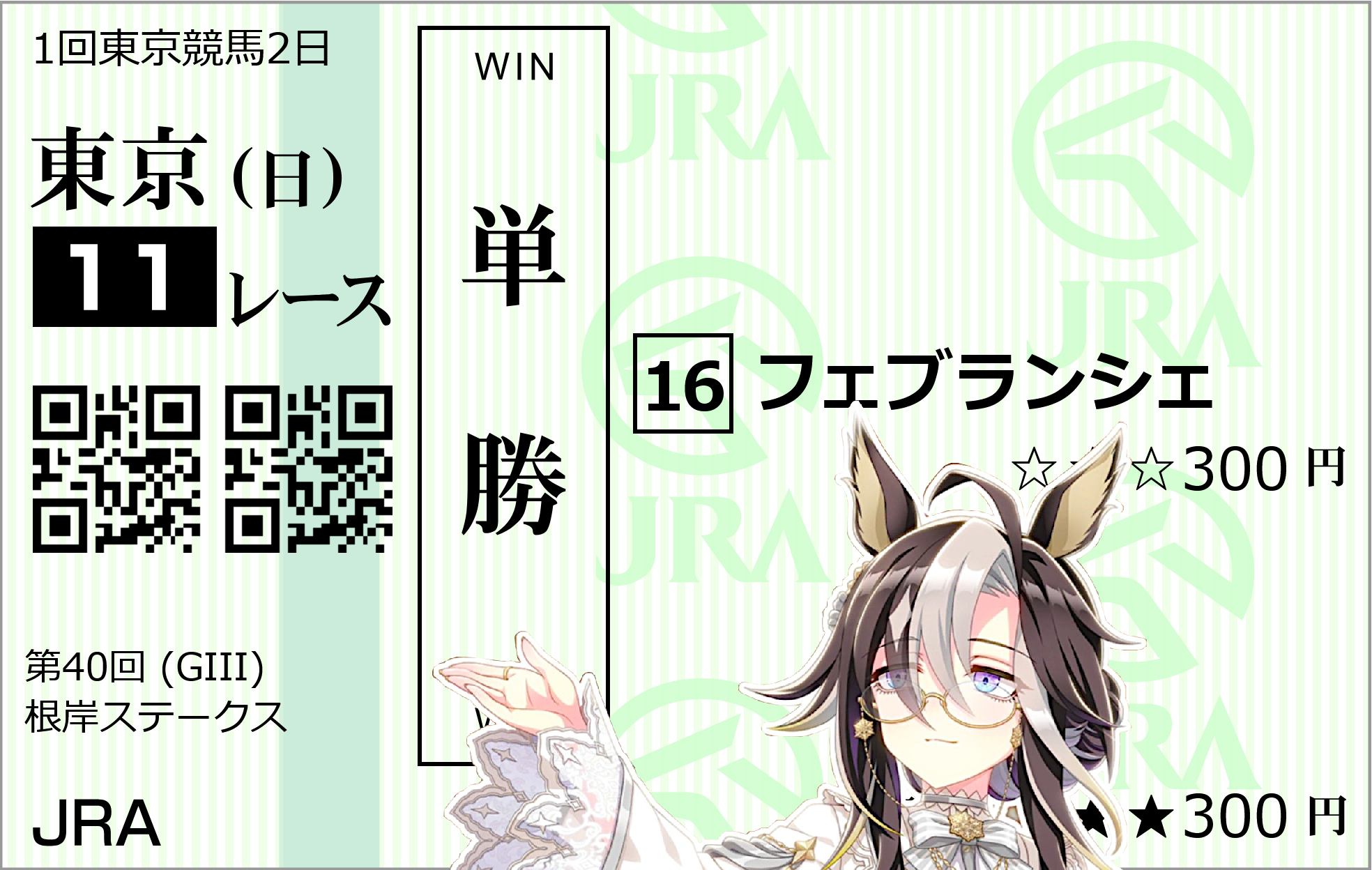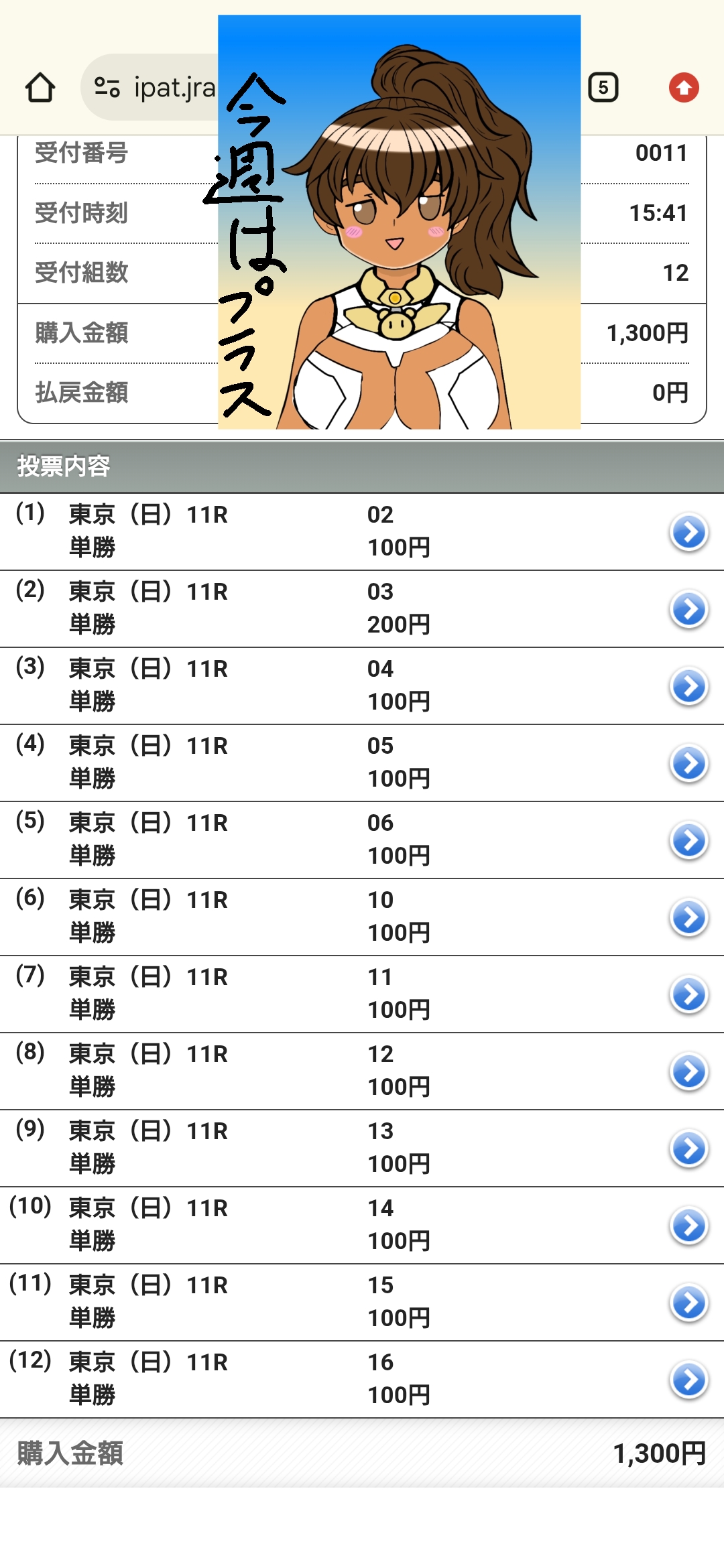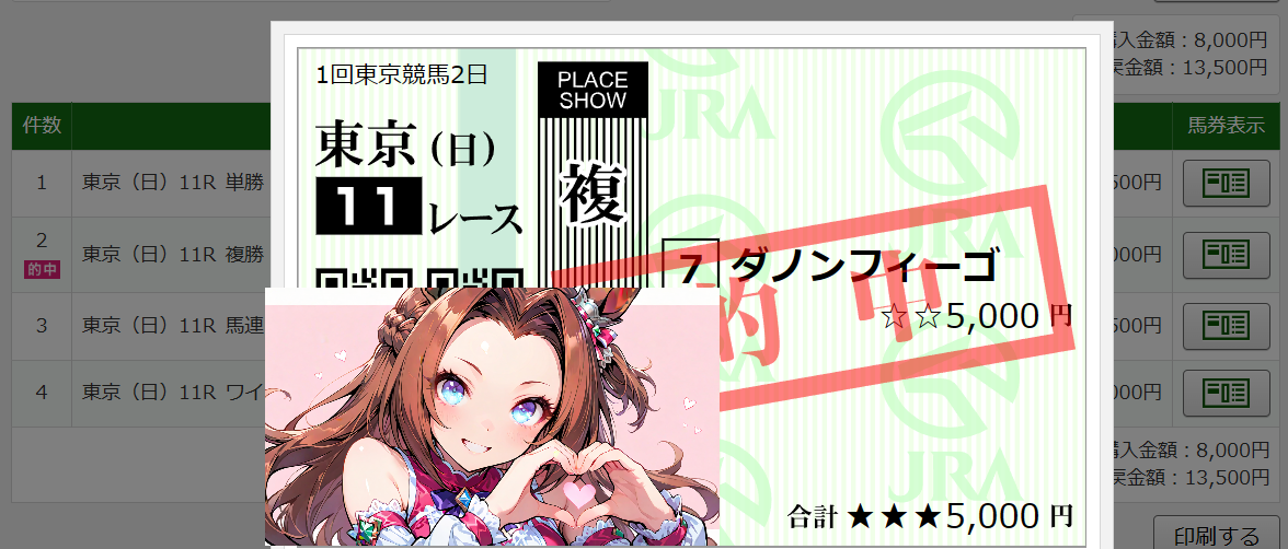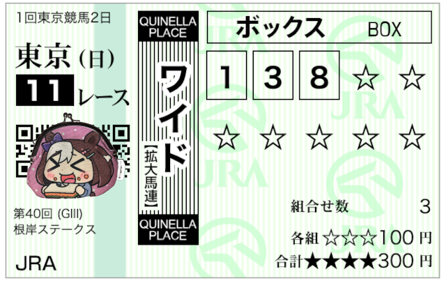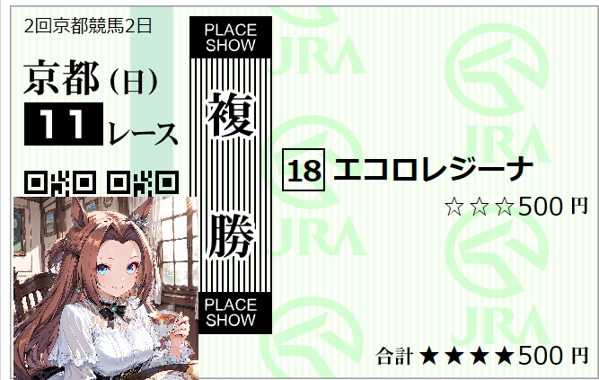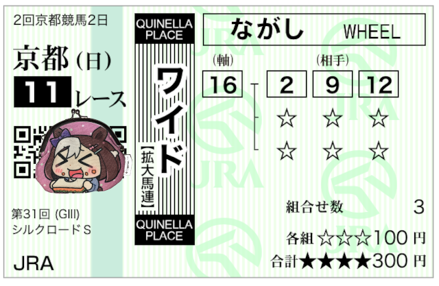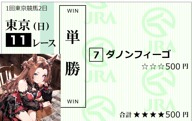| … | 883無念Nameとしあき26/02/01(日)15:58:15No.1384199936そうだねx2 1769929095289.png-(295075 B) 東京11r根岸ステークスは07番ダノンフィーゴさんの複勝のみ的中で+5,500円ですわ!! |