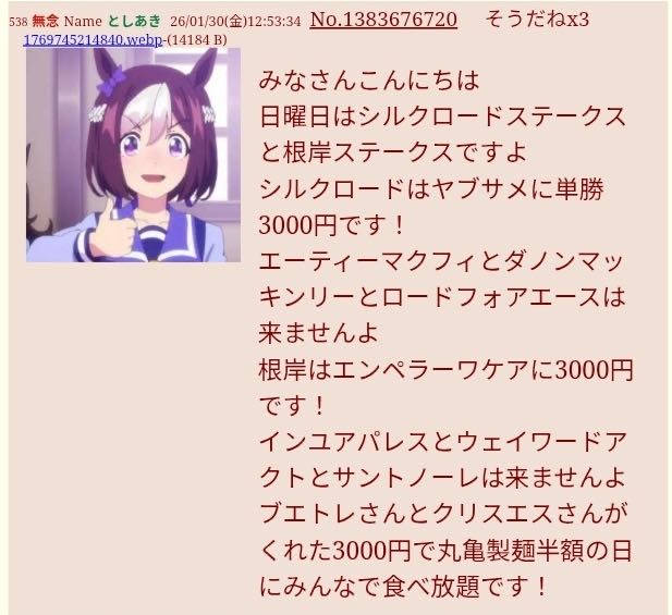 | … | 56無念Nameとしあき26/02/01(日)15:45:24No.1384196827そうだねx4 1769928324038.jpg-(214010 B) 根岸ステークスはガチで行くモンニ |