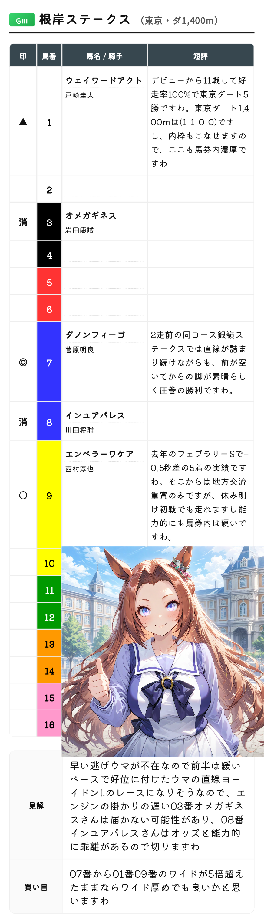| … | 38無念Nameとしあき26/02/01(日)15:38:50No.1384195280そうだねx1 1769927930430.png-(29425 B) 根岸Sは1、7、9のワイドで勝負であります |
