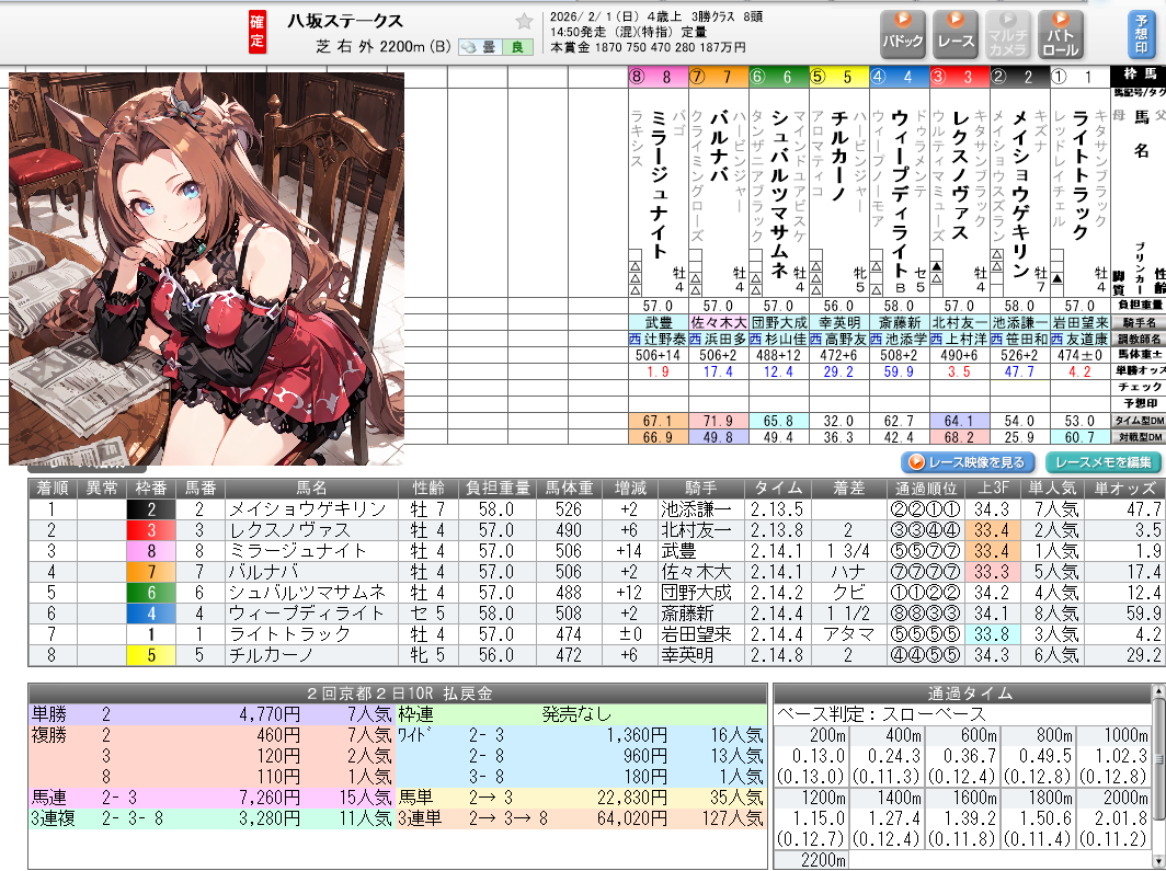 | … | 47無念Nameとしあき26/02/01(日)15:42:27No.1384196121+ 1769928147820.jpg-(270693 B) レイピアとメイショウはケアできてたのに1着が逃げきるとは… |