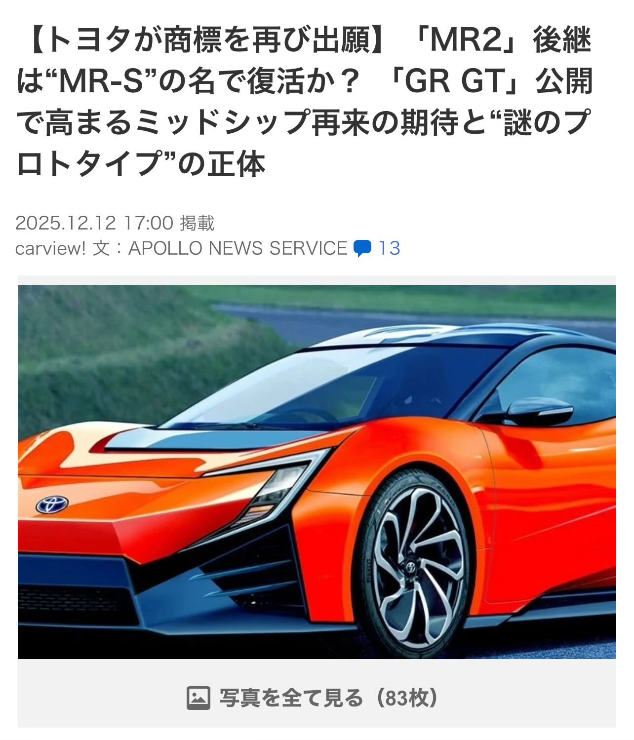 | … | 53無念Nameとしあき26/02/01(日)19:15:37No.1384248596+>トヨタは体力あるのだから他社と協力してでももっとスポーツ車を出してほしい |