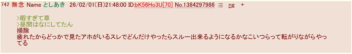 | … | 12無念Nameとしあき26/02/01(日)22:04:35 ID:VTJ2lH5wNo.1384303354そうだねx4>>sage爺昼間の掃除で夜10時まで疲れる(大嘘) |