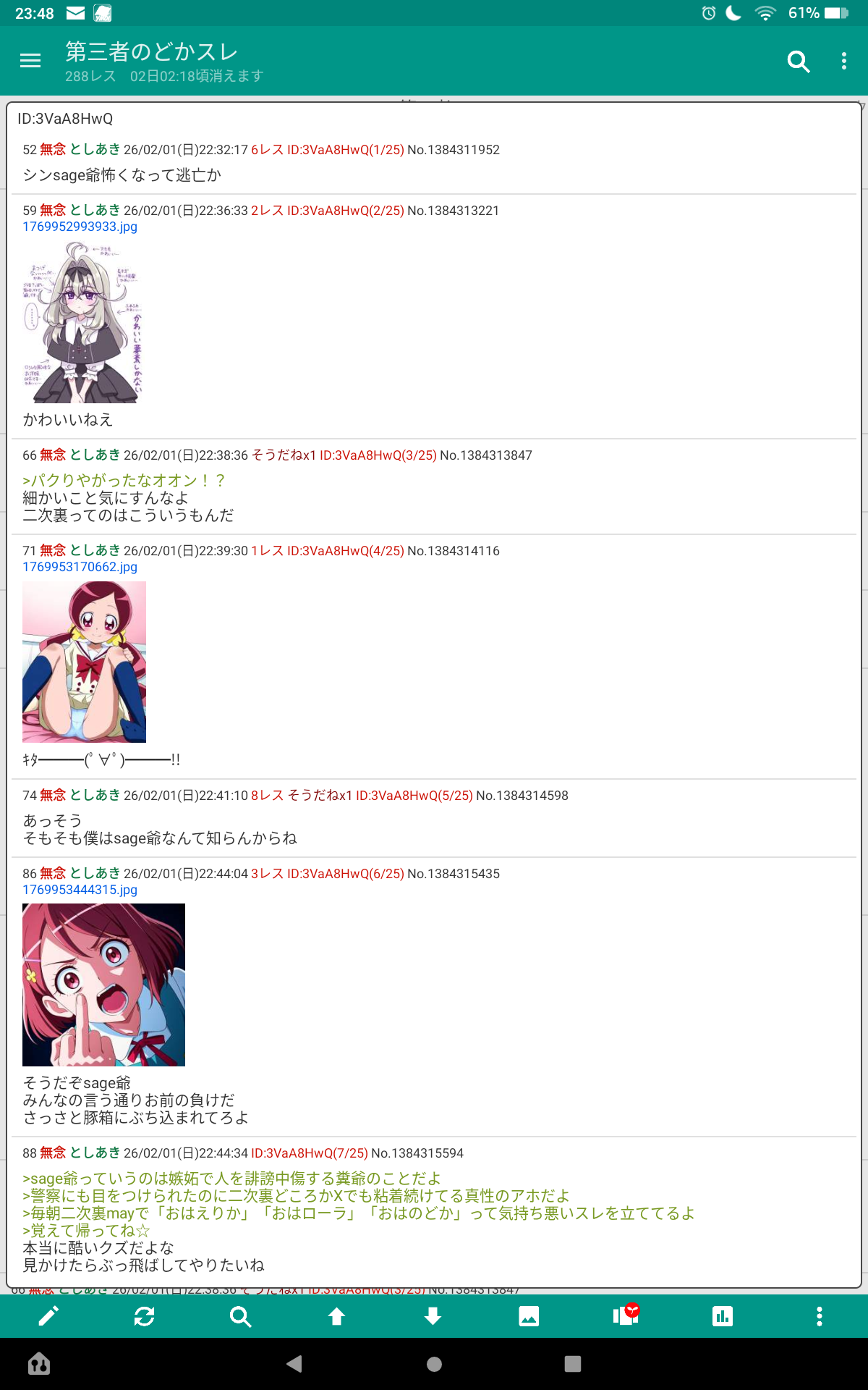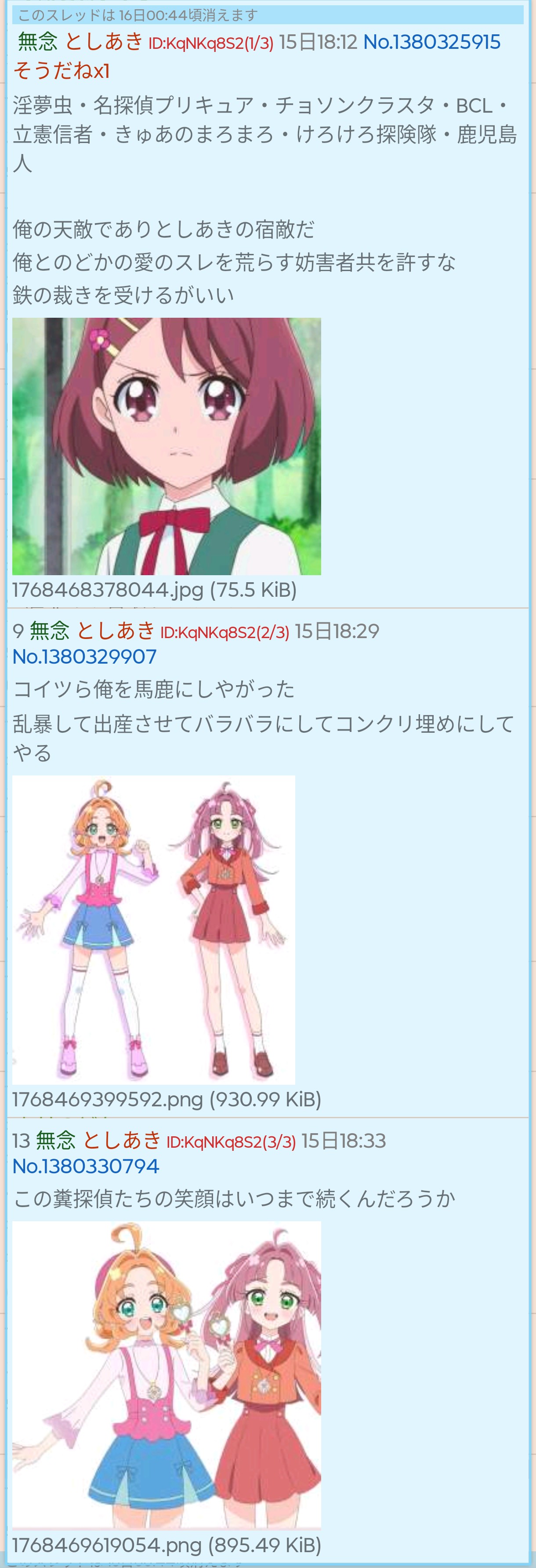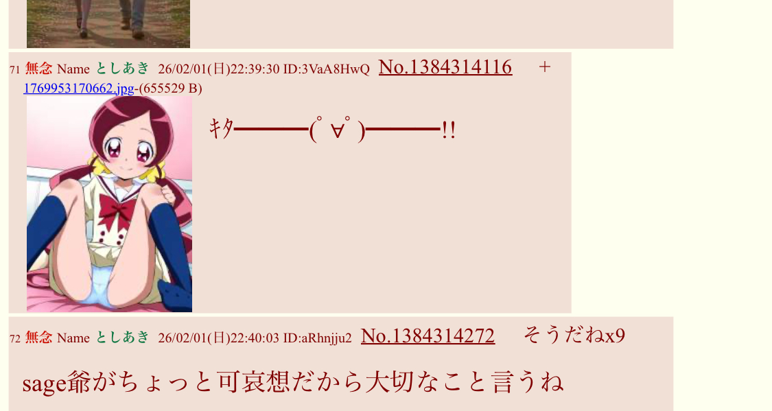 | … | 624無念Nameとしあき26/02/02(月)01:49:45 ID:O.wYn/2sNo.1384353505+ 1769964585633.png-(56337 B) >本家プリキュアスレはコピペ荒らしに狙われて涙が出出ますよ… |