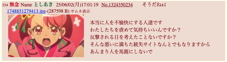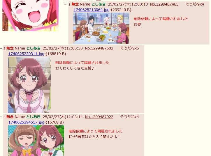 | … | 623無念Nameとしあき26/02/02(月)01:46:47 ID:ZH7/KkrMNo.1384353246そうだねx2本家プリキュアスレはコピペ荒らしに狙われて涙が出出ますよ… |
