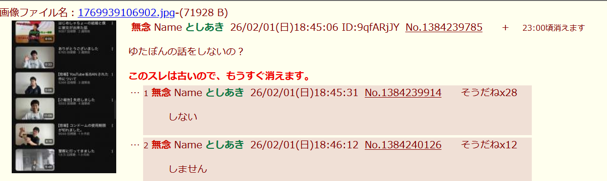 | … | 90無念Nameとしあき26/02/01(日)22:45:07 ID:Ti36TOYoNo.1384315736そうだねx6>あっそう |
