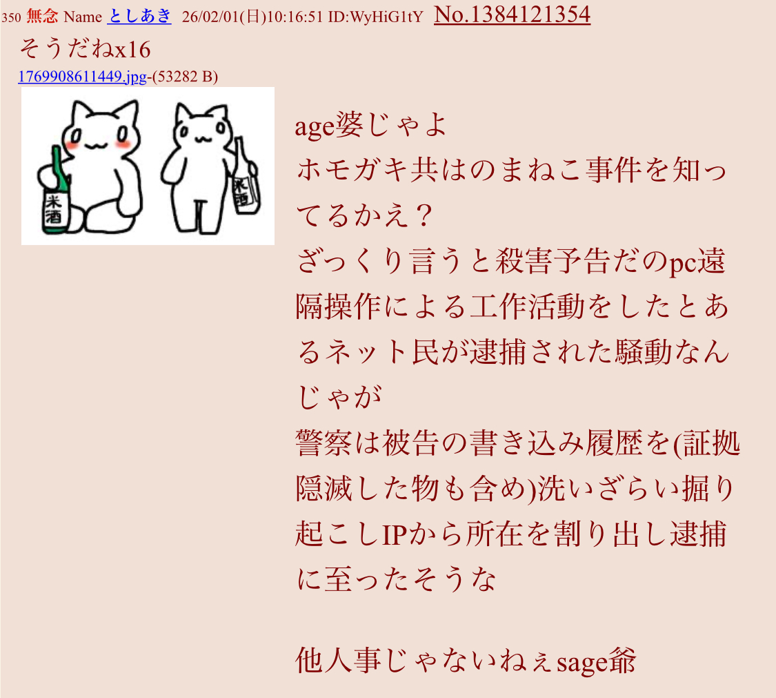 | … | 559無念Nameとしあき26/02/02(月)01:02:28 ID:j4BeZL3sNo.1384347951そうだねx9正直sage爺wikiが捜査資料になるとは夢にも思ってなかったゾ |