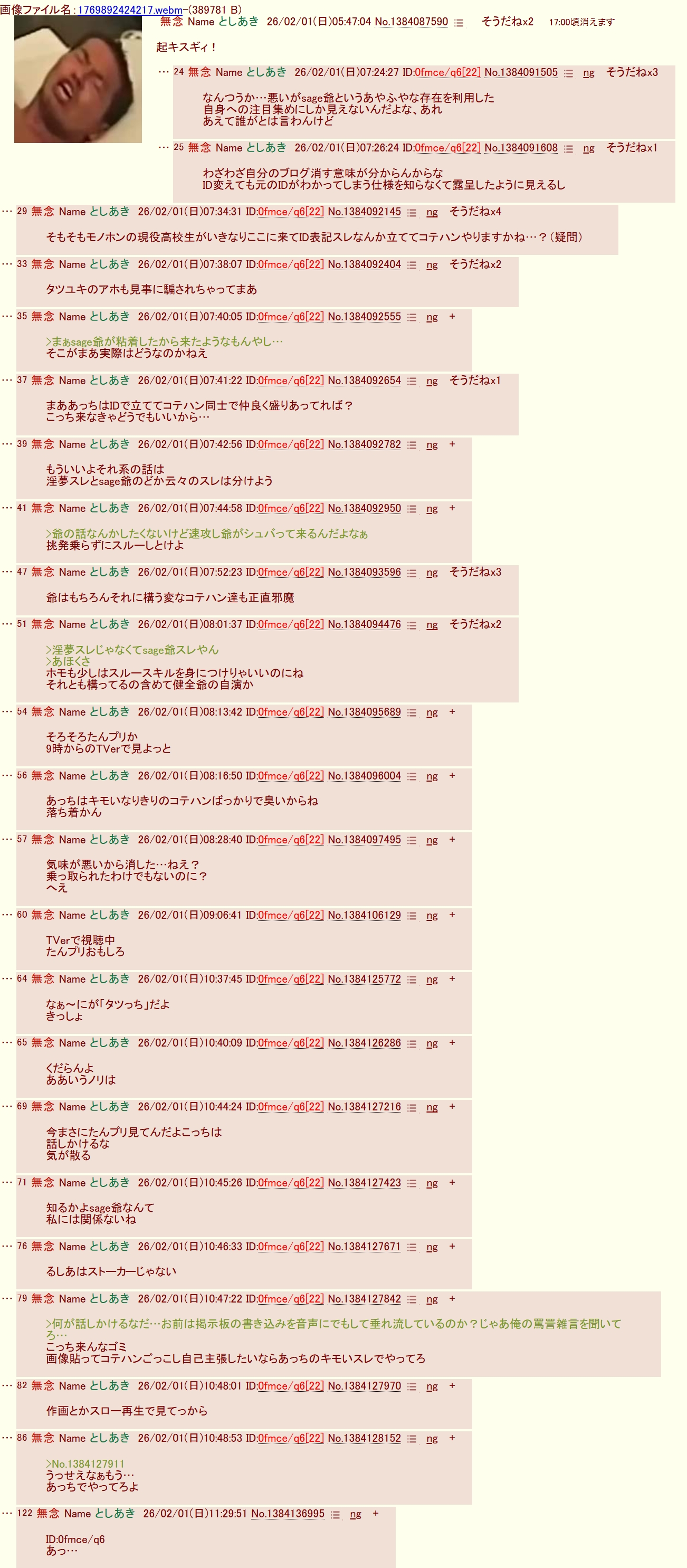 | … | 20無念Nameとしあき26/02/01(日)22:07:43 ID:btMGvZaQNo.1384304399そうだねx2>1769951177276.webm |