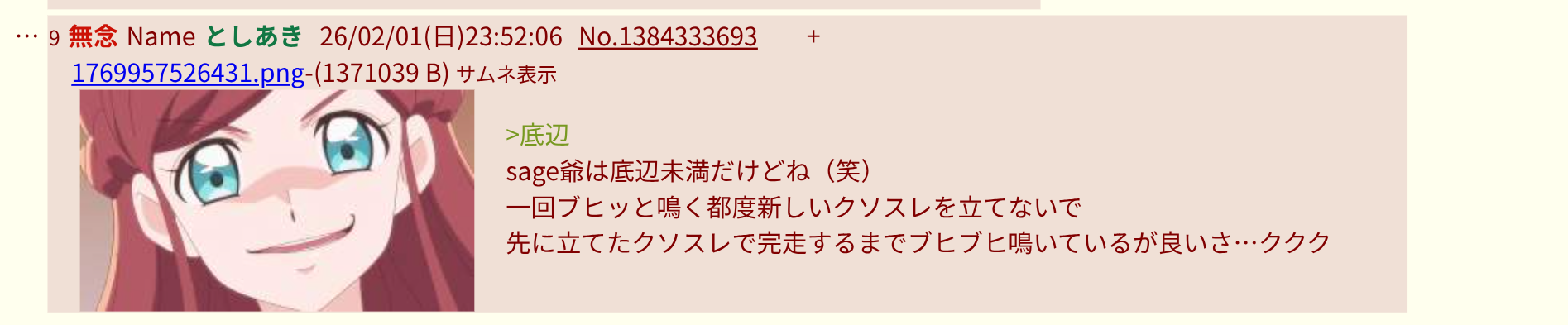 | … | 34無念Nameとしあき26/02/01(日)22:17:45 ID:aRhnjju2No.1384307505そうだねx1>さっきのスレとは一転してsage爺モードで荒らしに来そう |