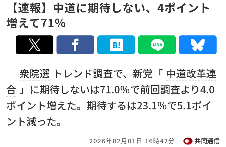 | … | 29無念Nameとしあき26/02/01(日)22:10:52No.1384305376そうだねx8出口調査では中道 |