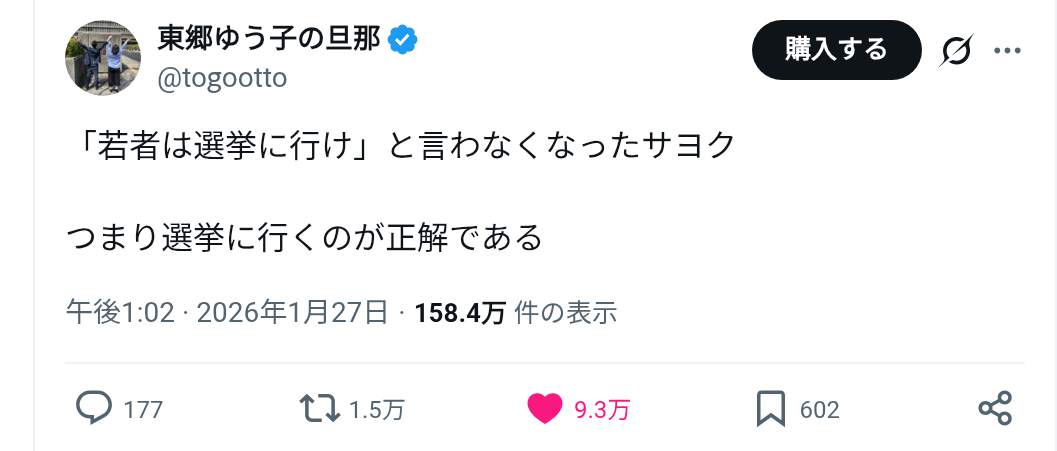 | … | 74無念Nameとしあき26/02/01(日)22:20:00No.1384308204そうだねx3今まで投票に行かない無党派がSNSとかを見て政治に興味が出だしたところ |