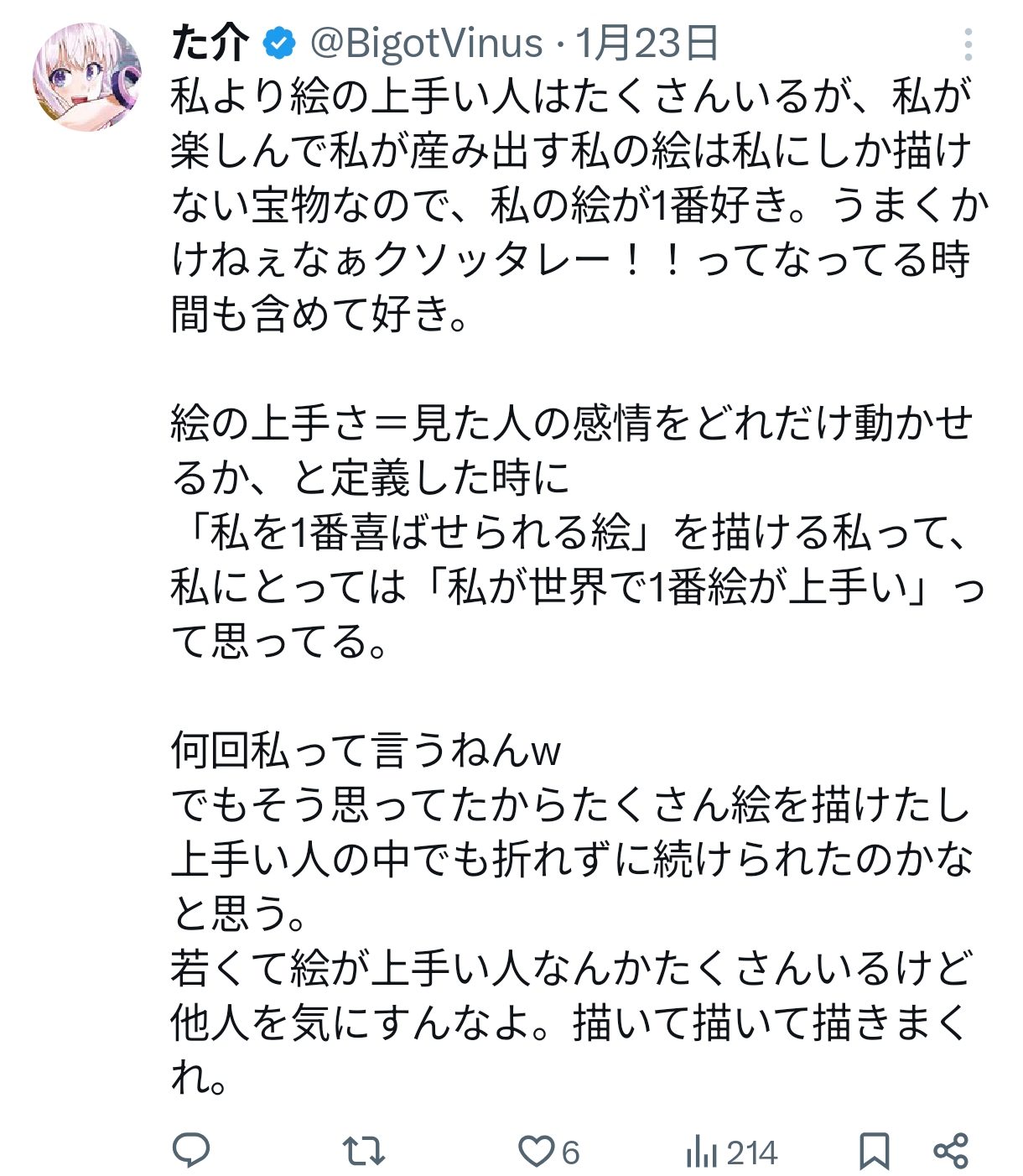 | … | 207無念Nameとしあき26/02/02(月)02:42:34No.1384357465そうだねx2>>「自分を一番喜ばせる絵が描けるから自分は世界で一番絵が上手い」 |