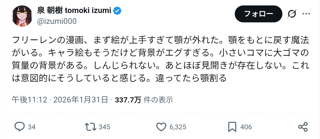 | … | 53無念Nameとしあき26/02/02(月)01:33:16No.1384351940そうだねx1フリーレンの絵というかコマが褒められるのは |