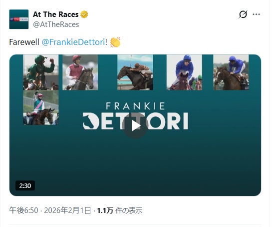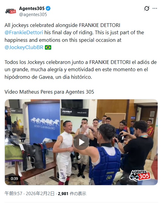 | … | 387無念Nameとしあき26/02/02(月)17:29:21No.1384449348+武豊騎手「今日ブラジル競馬で引退するのがフランキー(デットーリ)─今回は本当のようです─GⅠを前倒しに組み世界的名手の引退に花を添える主催側の粋な計らい。彼がブラジルで引退する背景には亡くなった親友との約束だとも聞きました」 |