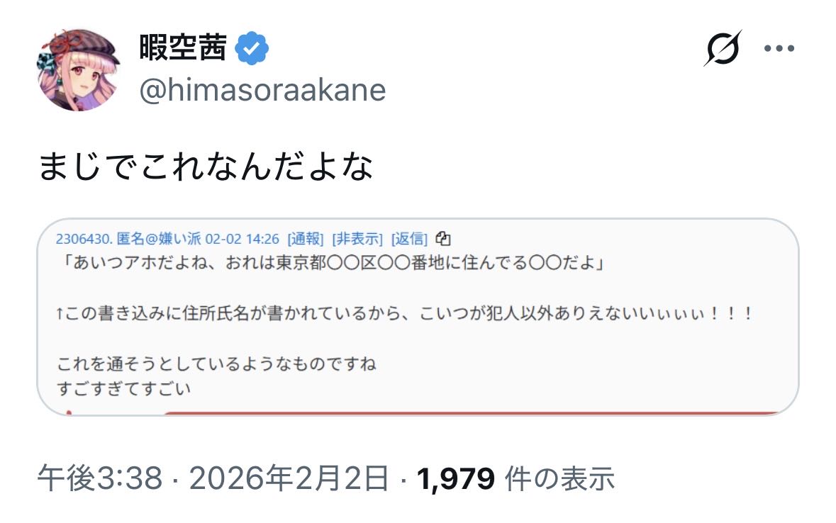 | … | 75無念Nameとしあき26/02/02(月)18:35:53 IP:126.203.*(bbtec.net)No.1384462727そうだねx2カルピス軍団とのつながりを公言してた市議の方とか堀口さん経由で暇アノンの開示情報がCに渡されてるとか言ってた人がそういえばいましたよね?? |