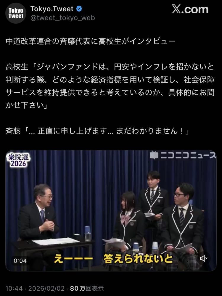 | … | 41無念Nameとしあき26/02/02(月)20:39:23No.1384494426そうだねx16学生「ファンドで消費税ゼロの財源作るとのことですがどうやって作るんですか?」 |