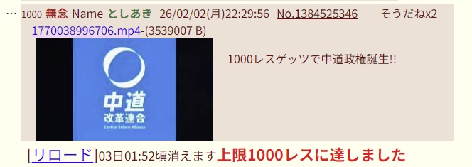 中道改革連合スレ上限1000レスに達しました