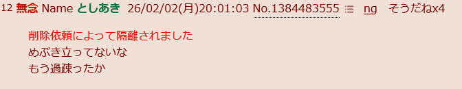 | … | 7無念Nameとしあき26/02/02(月)23:46:03No.1384543278そうだねx1いま脳死状態なの? |