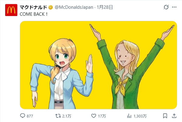 | … | 161無念Nameとしあき26/02/03(火)02:00:17No.1384561530+>マックは大企業だけど大衆店なわけで安っぽいコラボも別にそんなモンじゃね?くらいの印象 |