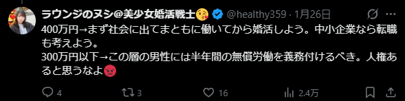 | … | 68無念Nameとしあき26/02/03(火)07:01:55No.1384571954+>…なんでその思想で年収400万男とマッチングしてんの? |