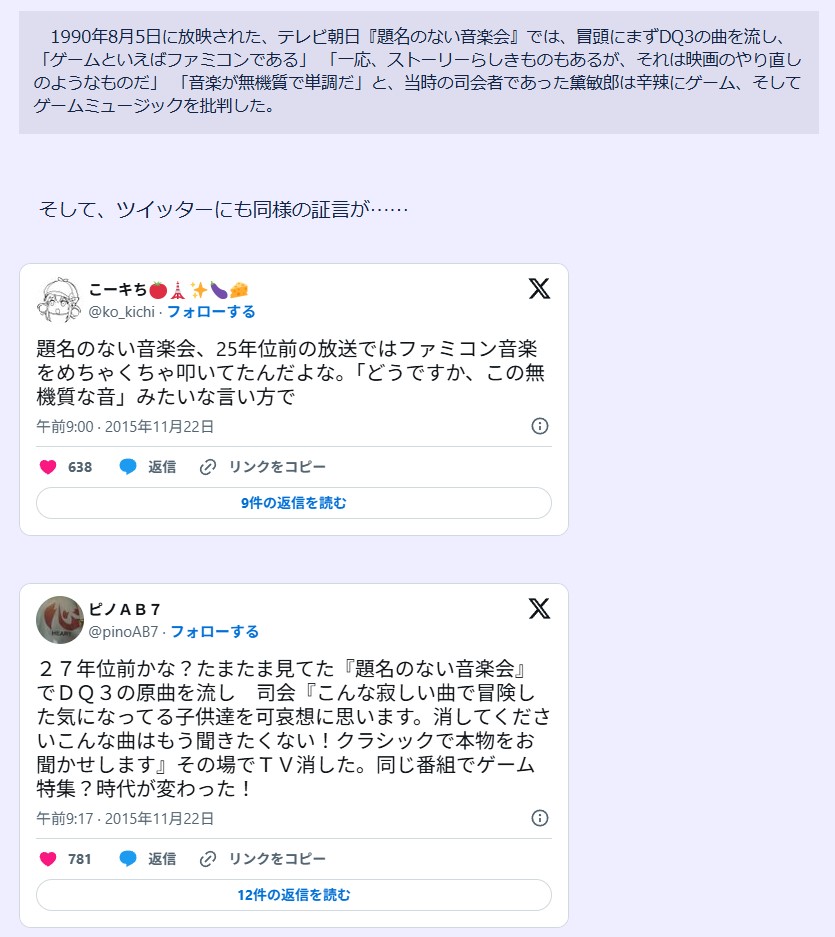 ゲーム音楽なんて下らない偽物聞いてないで本物の音楽を聞きましょう的な事を言っただけで死後もずっと叩かれてる人