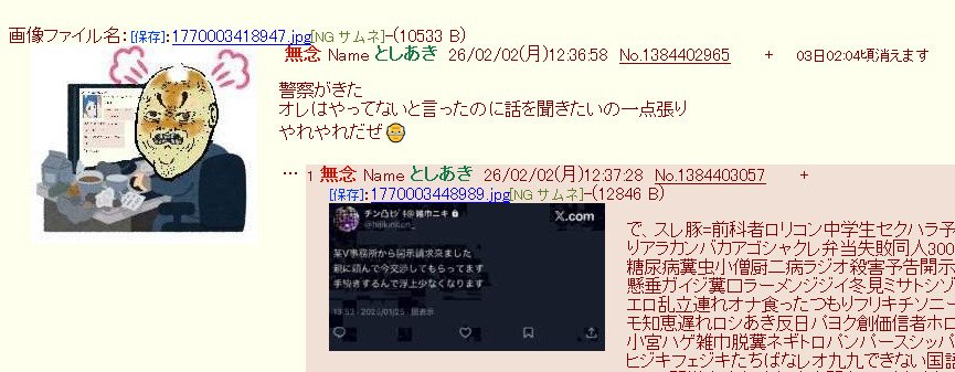 | … | 14無念Nameとしあき26/02/03(火)09:38:39No.1384586497そうだねx2>1770078652913.jpg |
