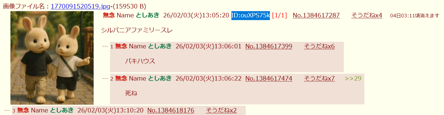 | … | 15無念Nameとしあき26/02/03(火)13:44:41No.1384623800そうだねx5 1770093881901.jpg-(17210 B) >シルバニアファミリーがパヨクだとはな… |
