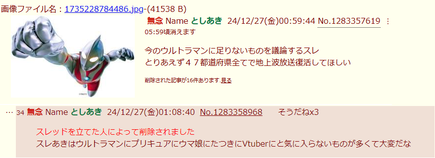 | … | 9無念Nameとしあき26/02/03(火)14:38:08No.1384632105そうだねx1>ウルトラ関係ないランクに乗ったからと言って円谷プロ正式の映像に出てない時点で出禁みたいなもんだろ |